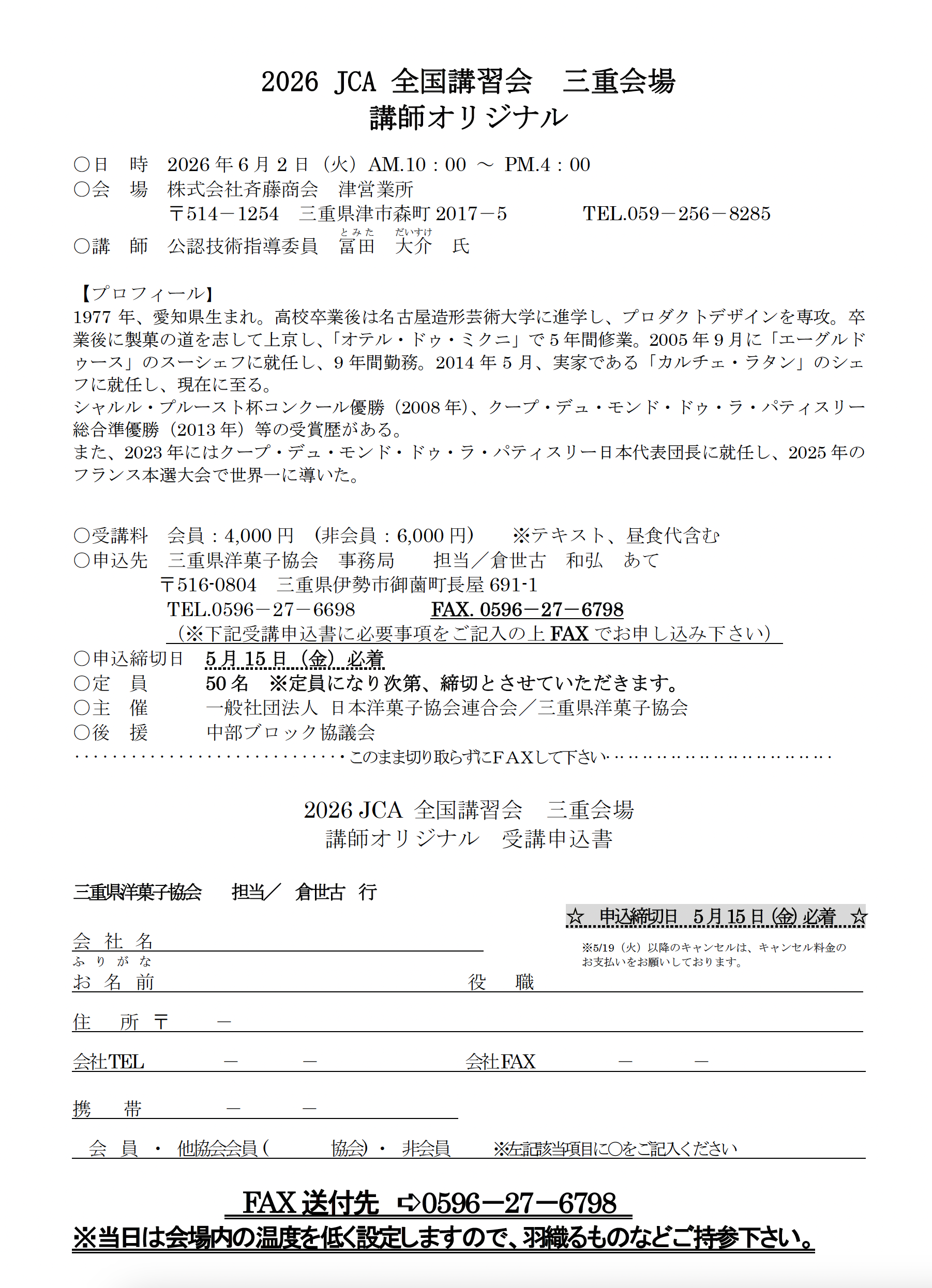 2026年4月16日 三重県洋菓子協会 技術講習会のご案内 三重県洋菓子協会様より、人気パティシエによる講習会のご案内が来ました。岐阜県洋菓子協会の皆様にもご案内させていただきます。 PDFはこちら 前の記事2026.04.15 有信 瑠星 氏 マジパン講習会次の記事 愛知県洋菓子協会 技術講習会のご案内